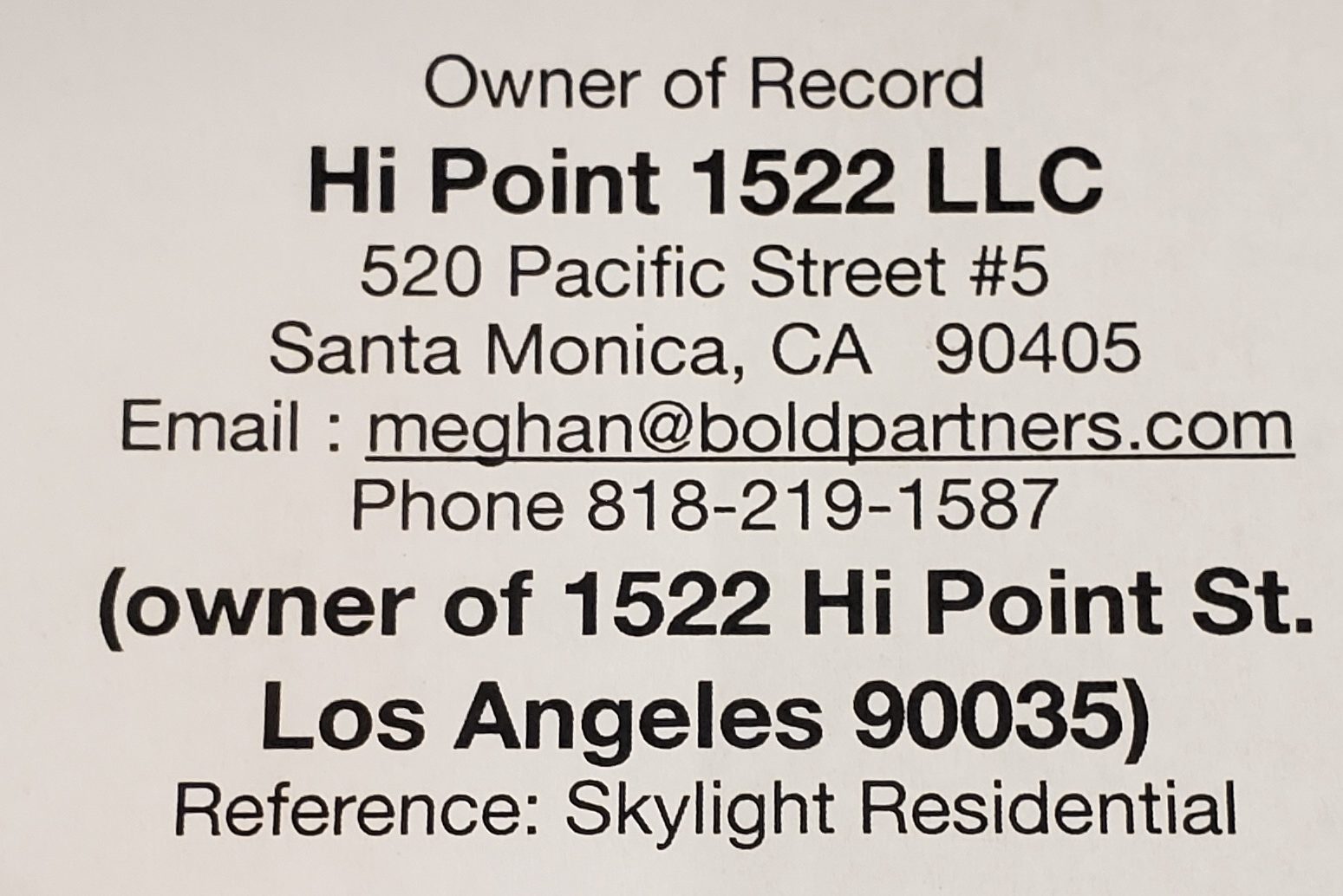 To: Hi Point 1522 LLC; 520 Pacific Street #5, Santa Monica CA 90405. Email: meghan@boldpartnersre.com. Phone 818-219-1587.